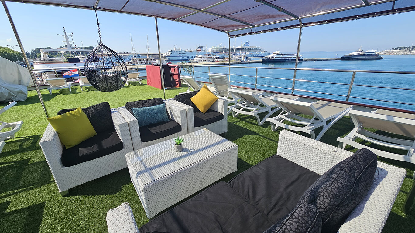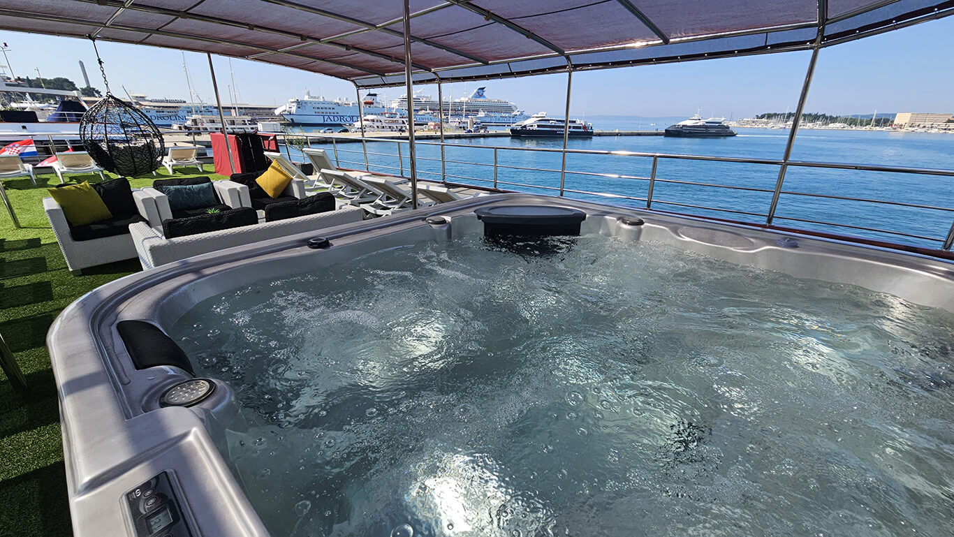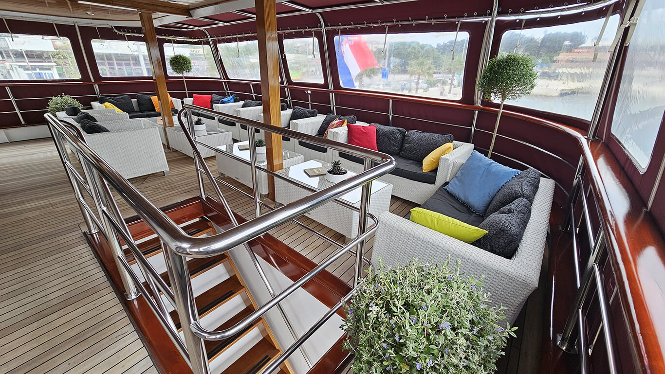 A standout feature of the vessel is its expansive 230 m² sun deck, where guests can unwind in the jacuzzi, bask in the sunshine on comfortable loungers, or simply enjoy panoramic sea views.