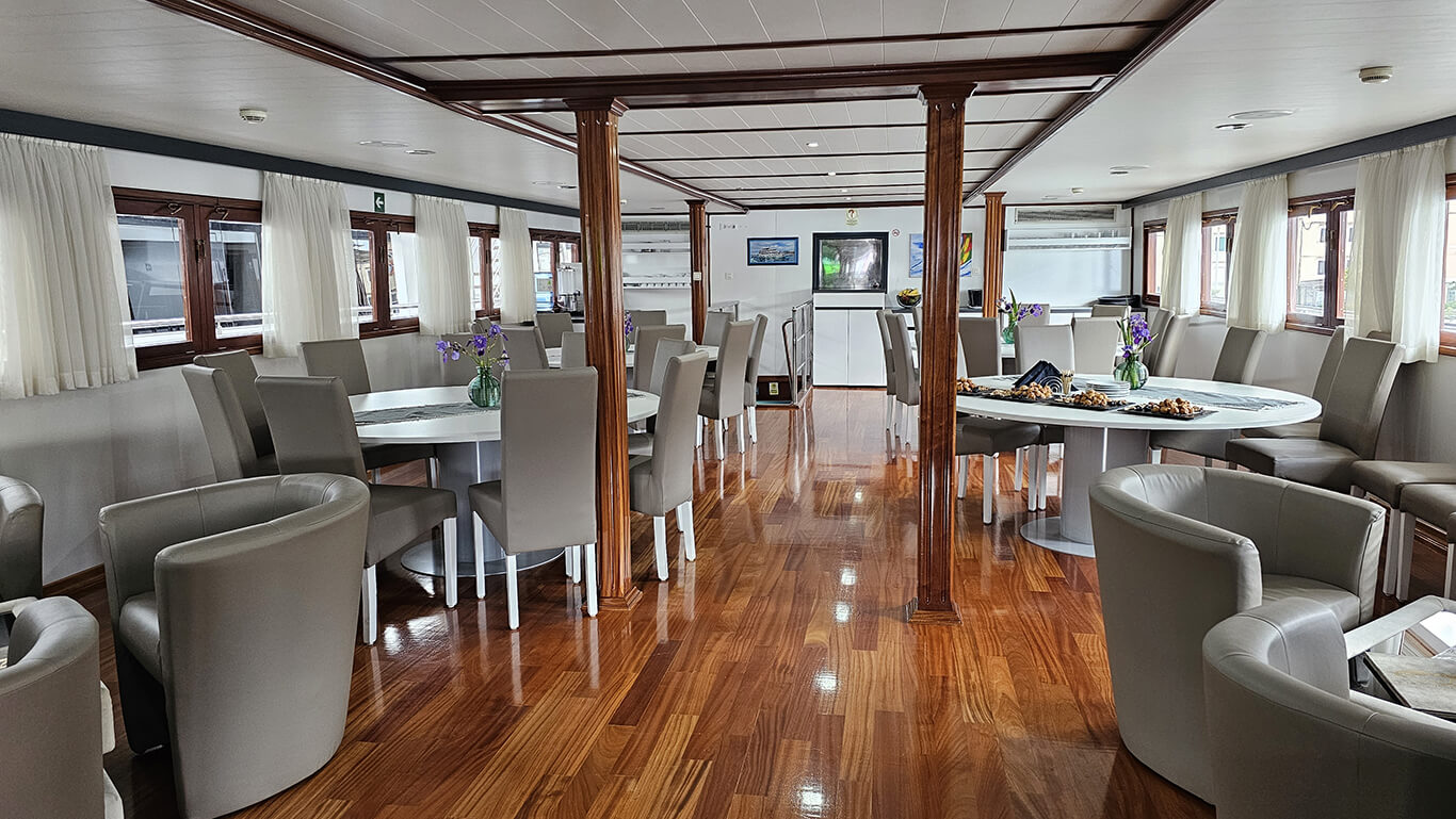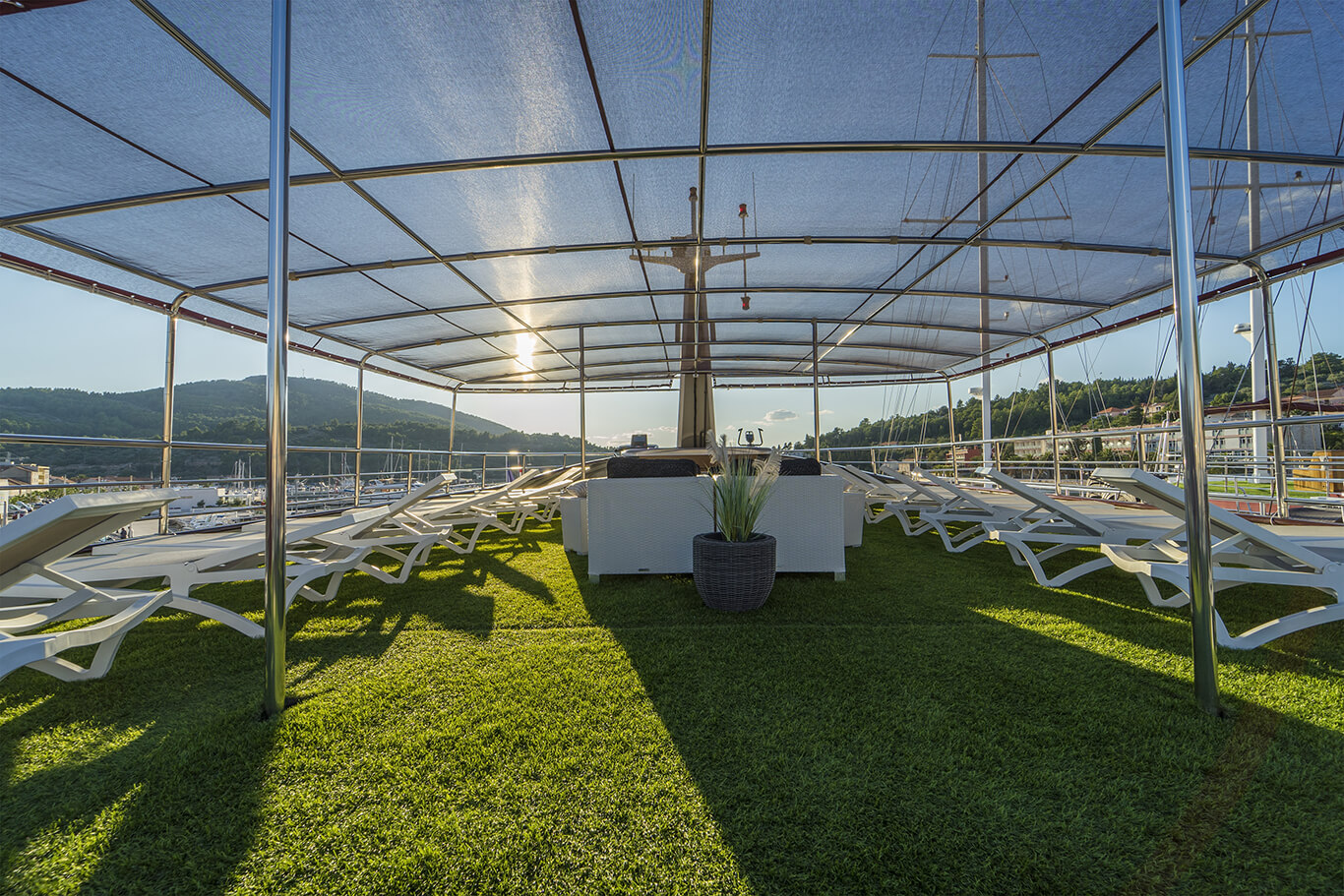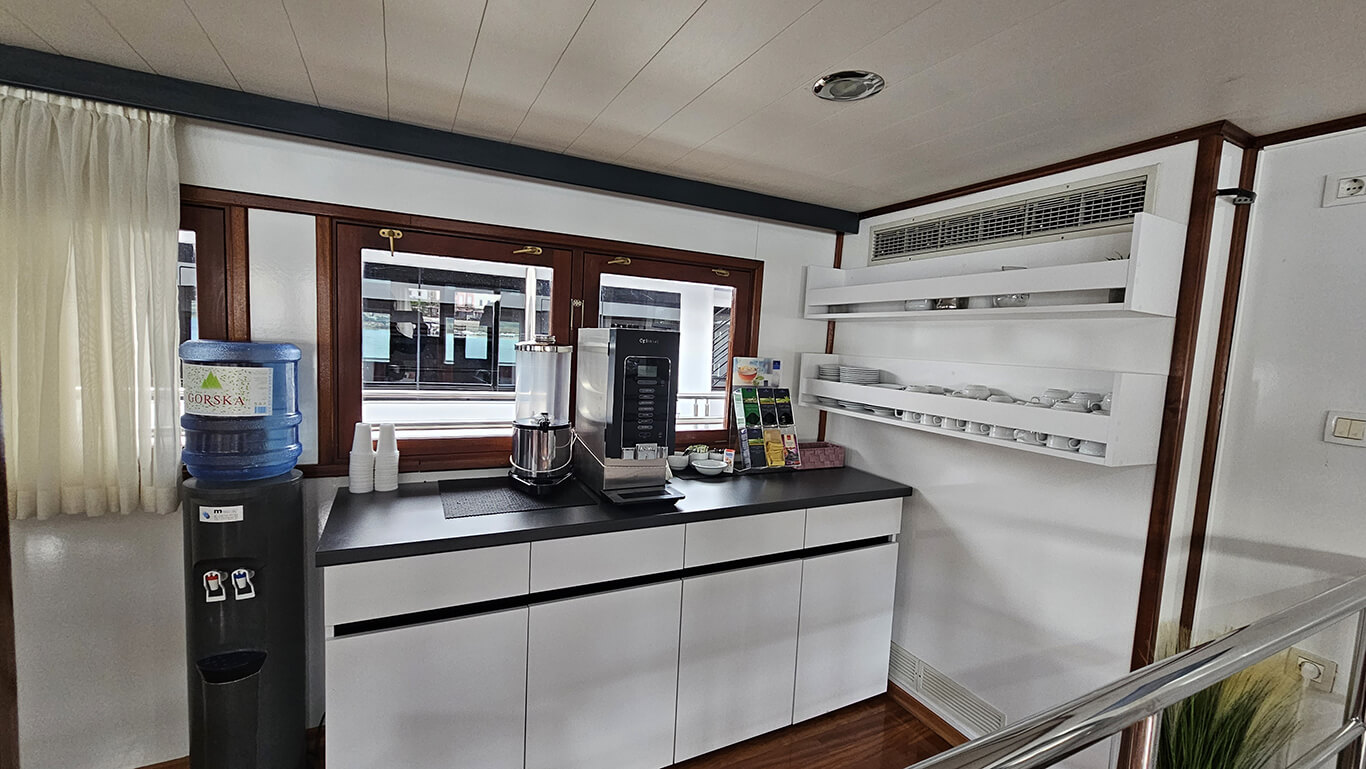 A standout feature of the vessel is its expansive 230 m² sun deck, where guests can unwind in the jacuzzi, bask in the sunshine on comfortable loungers, or simply enjoy panoramic sea views.