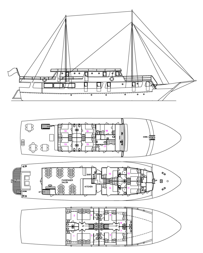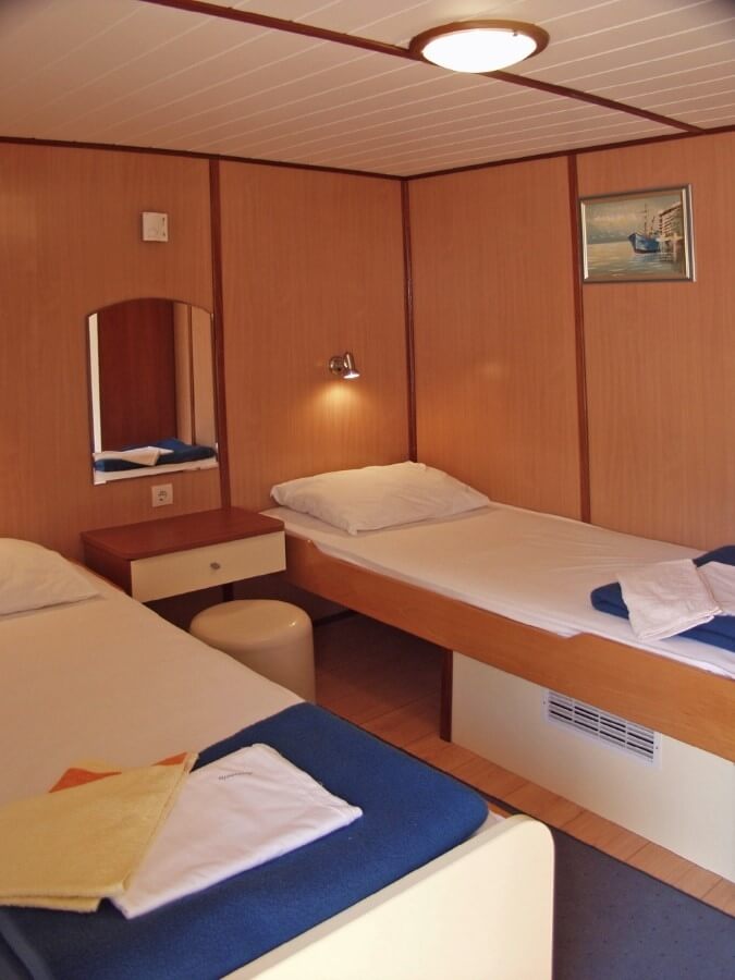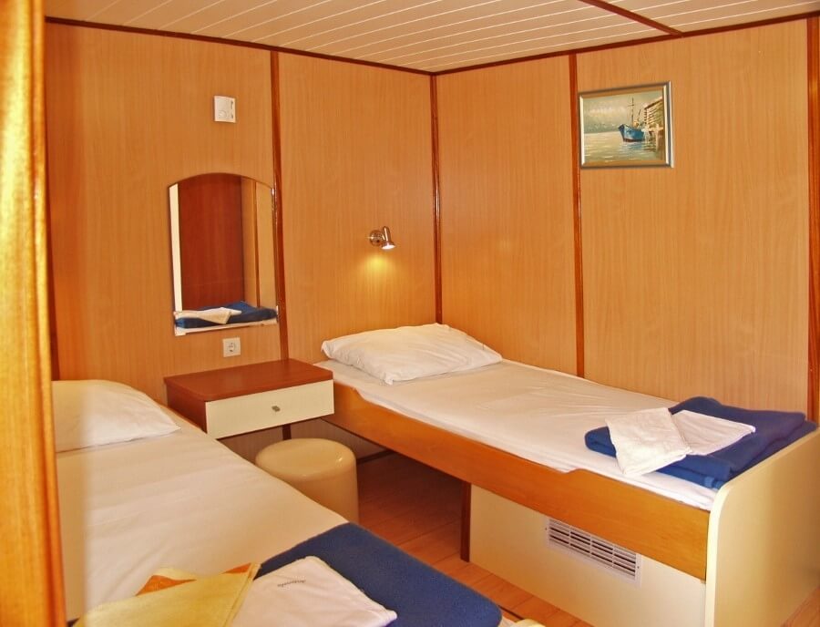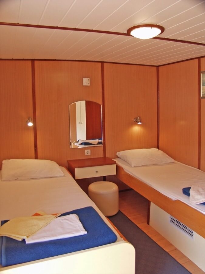 - Cabins: 18 cabins with twin or double beds + 1 single cabin for guide