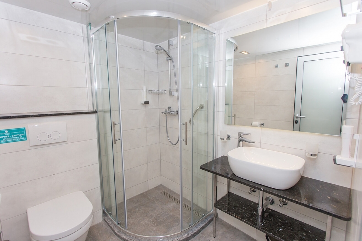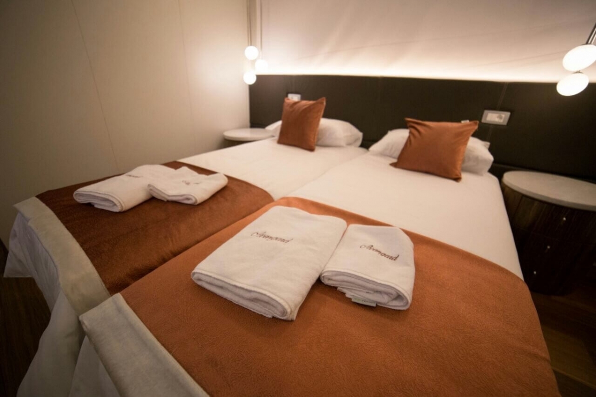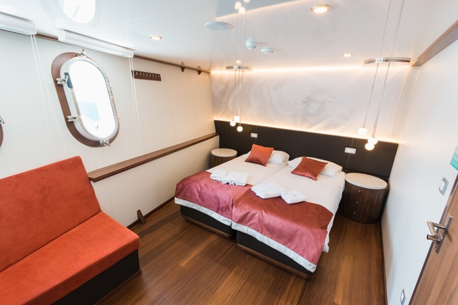 With the length of 50m and width of 8,7m, MV Avangard offers a maximum capacity of 36 passengers in 18 twin or double cabins, guaranteeing an intimate setting for all guests. Cabins built by up-to-date standards, fully equipped with A/C, safe deposit box, fire alarm and audio system for announcements by the captain or Tour Director. Bathrooms are equipped with toilet, shower, washbasin and hair dryer.