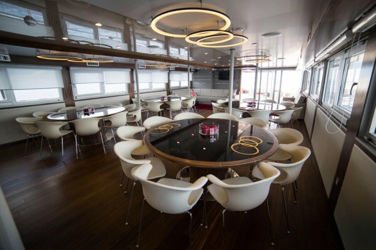A fully air-conditioned upper deck dining room can accommodate all passengers at once, yet offer a great degree of privacy for each guest. The restaurant includes the bar area with LCD TV, with a corner table for buffet breakfast. A portion of the dining area extends outdoors as a lounge area, offering sweeping panoramic views of the surroundings. Free wireless internet access (Wi-Fi), hot tub..