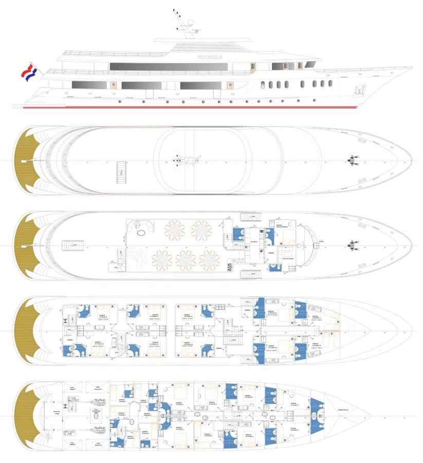 - 10 Main deck ensuite cabins (14.8 – 17.8 m2)