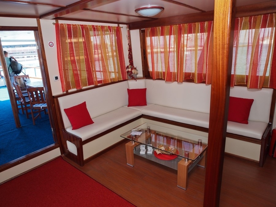 Guests can unwind on the expansive sun deck, where loungers and panoramic sea views provide the perfect setting for relaxation under the Mediterranean sky. Inside, the cozy and stylish dining area invites you to enjoy freshly prepared meals inspired by local flavours and ingredients.