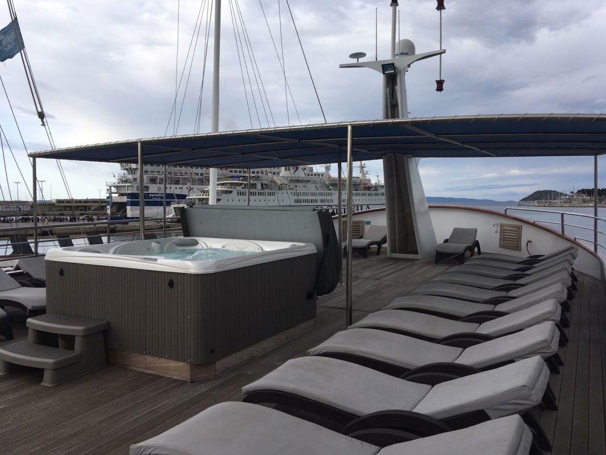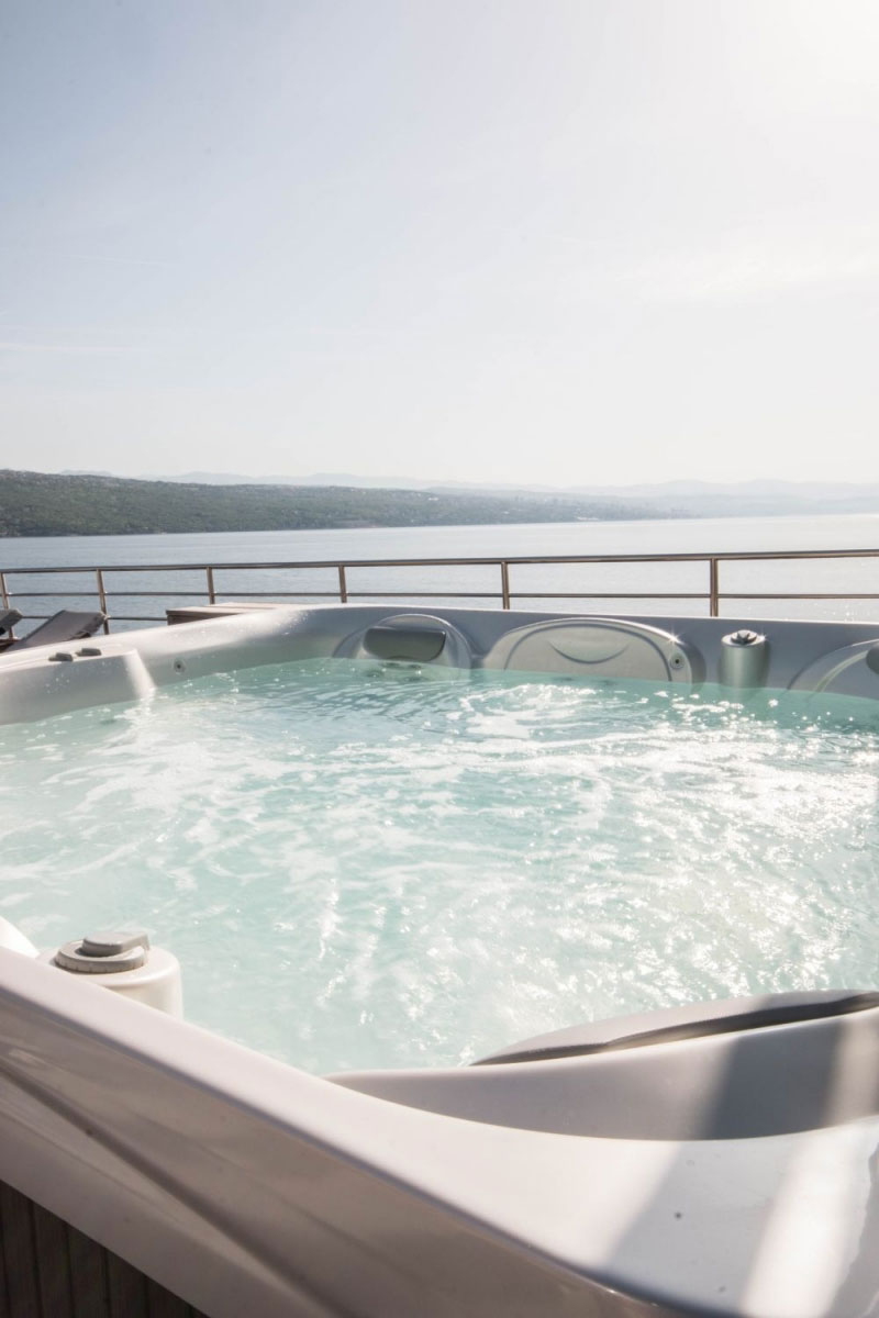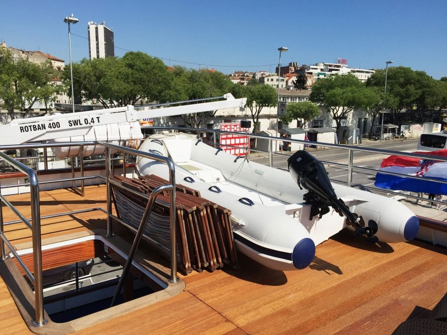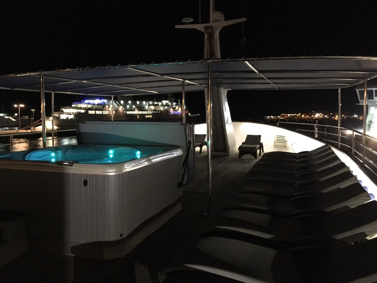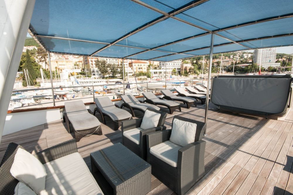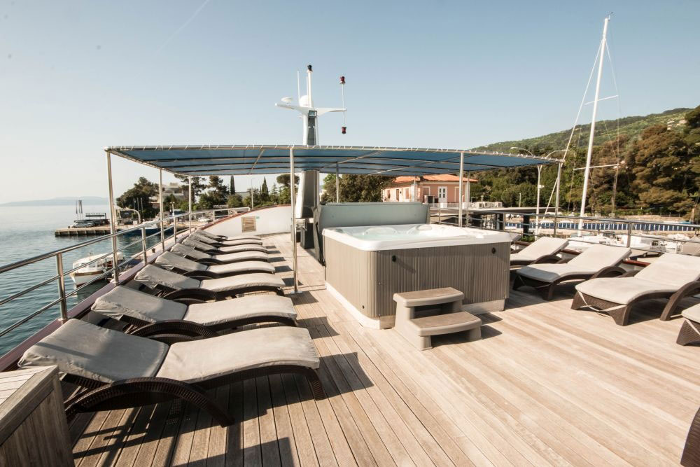 The expansive sun deck invites guests to unwind with loungers, a jacuzzi, and panoramic sea views, while the swimming platform at the rear provides easy access to the crystal-clear Adriatic – perfect for refreshing dips or a bit of snorkeling.