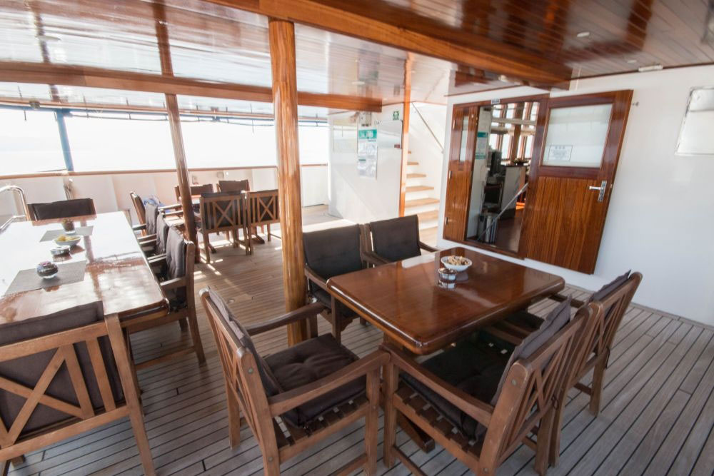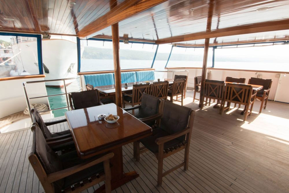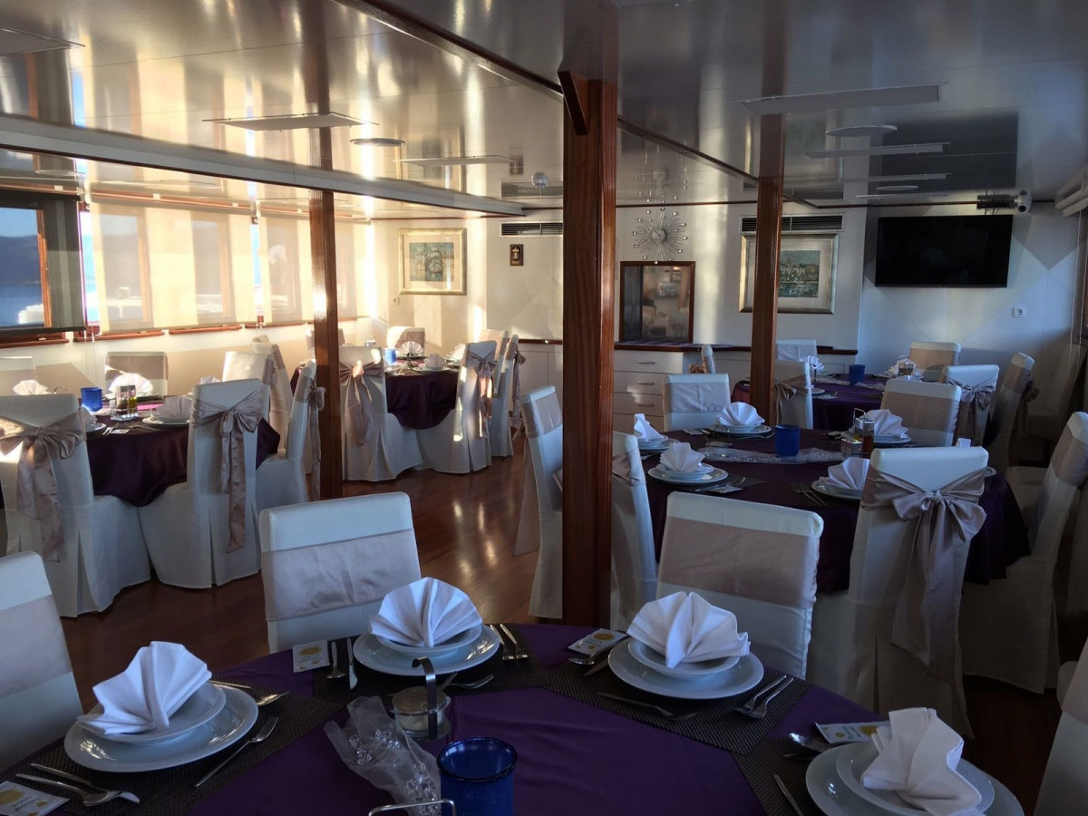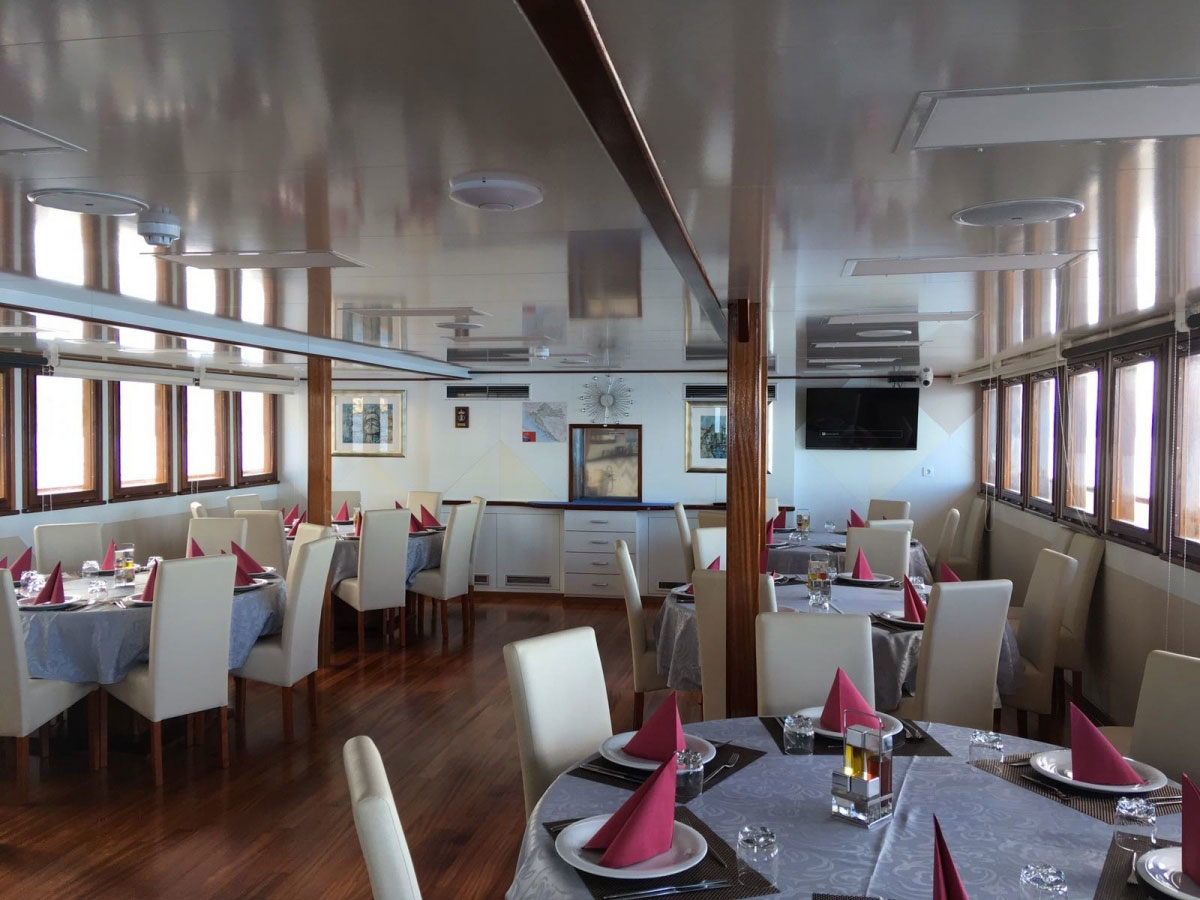 Inside, the main salon combines comfort and style with a modern dining area, lounge seating, a bar, and a smart TV for guest entertainment. Meals onboard are a highlight, with fresh and flavorful dishes prepared daily by the vessel’s onboard chef, often inspired by the rich culinary heritage of the region.
