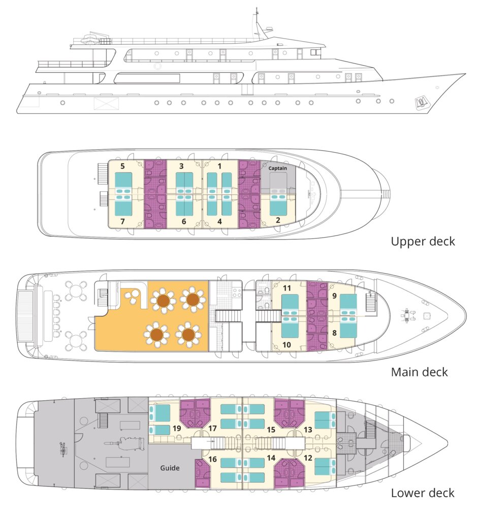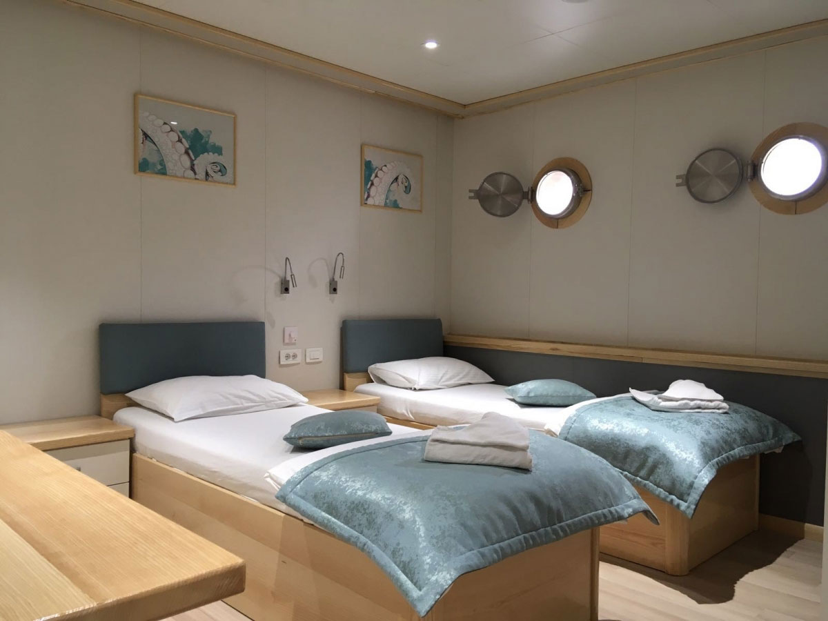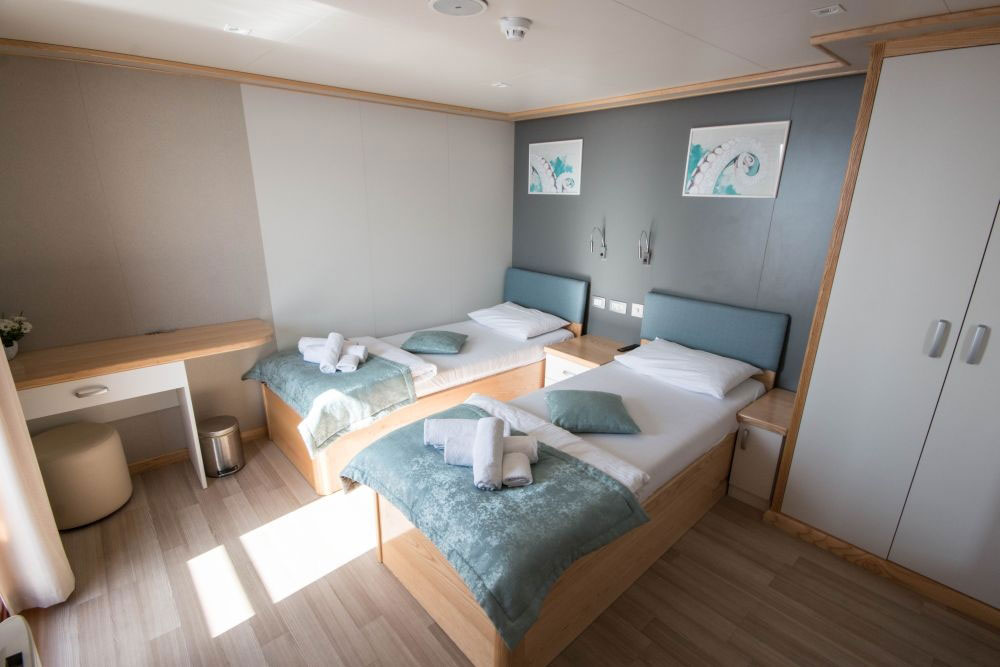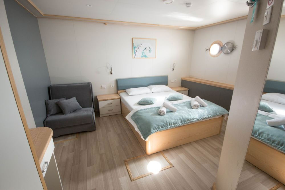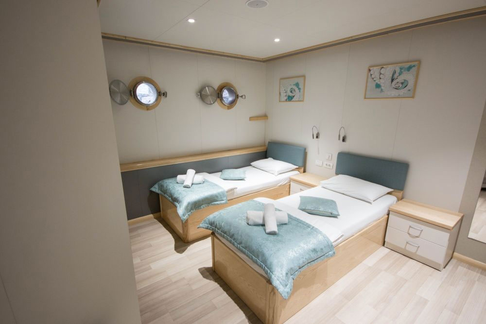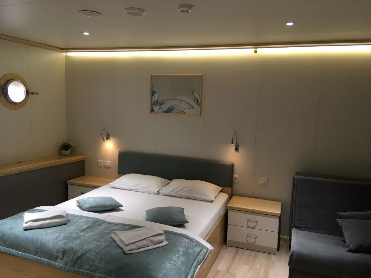 Built in 2015, the MV Fantazija offers a refined and spacious cruising experience for up to 36 guests. The vessel features 18 comfortable cabins, thoughtfully arranged as double or twin options, each equipped with air conditioning, flat-screen TVs, safes, and daily cabin service – ensuring a relaxing stay throughout your journey.