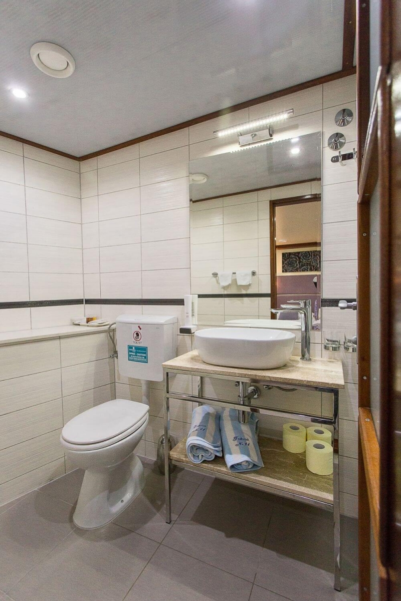 The heart of the ship is its inviting main salon, which features a refined dining area, a cozy bar, and a comfortable lounge – ideal for socializing or simply enjoying the journey. Step onto the upper deck and you’ll find a generous sundeck with loungers, a relaxing hot tub, and sweeping views of the shimmering Adriatic. A dedicated swimming platform at the rear of the ship makes it easy to dive in for a swim or enjoy water activities like snorkeling.