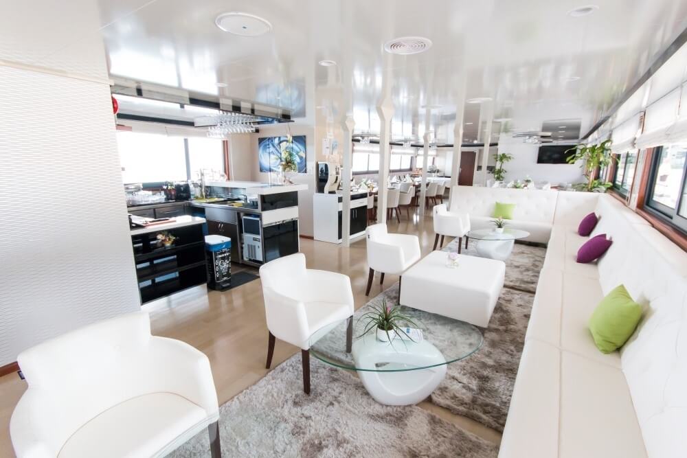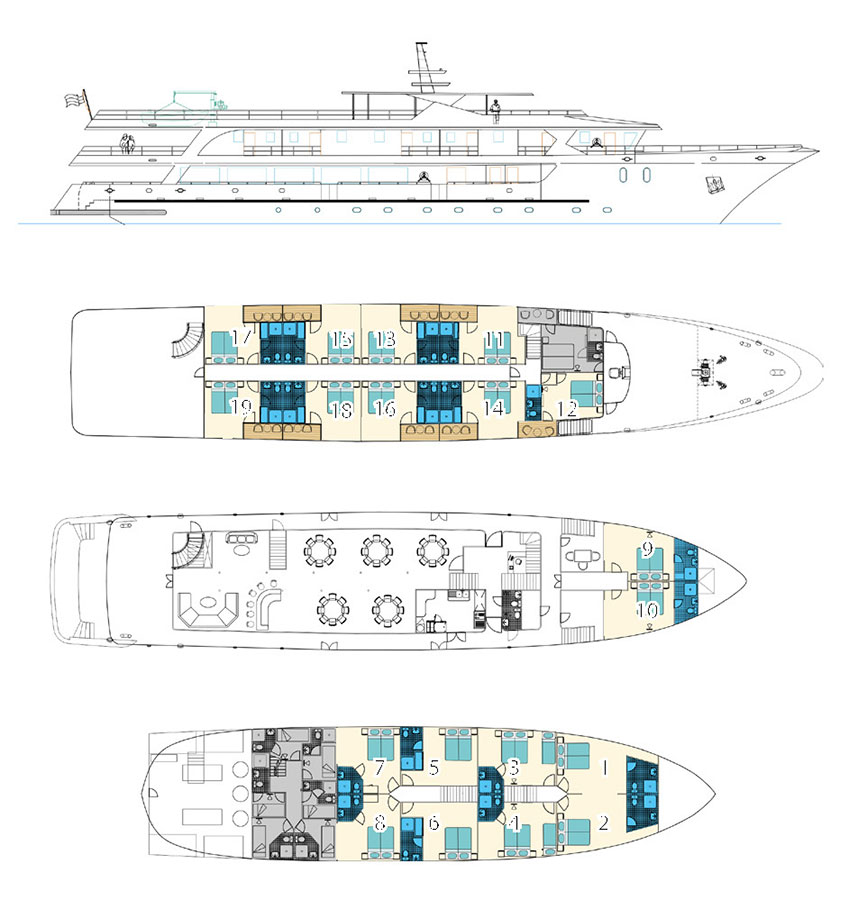 - 9 cabins on upper deck each with private balcony (VIP cabins) and inner communication to restaurant