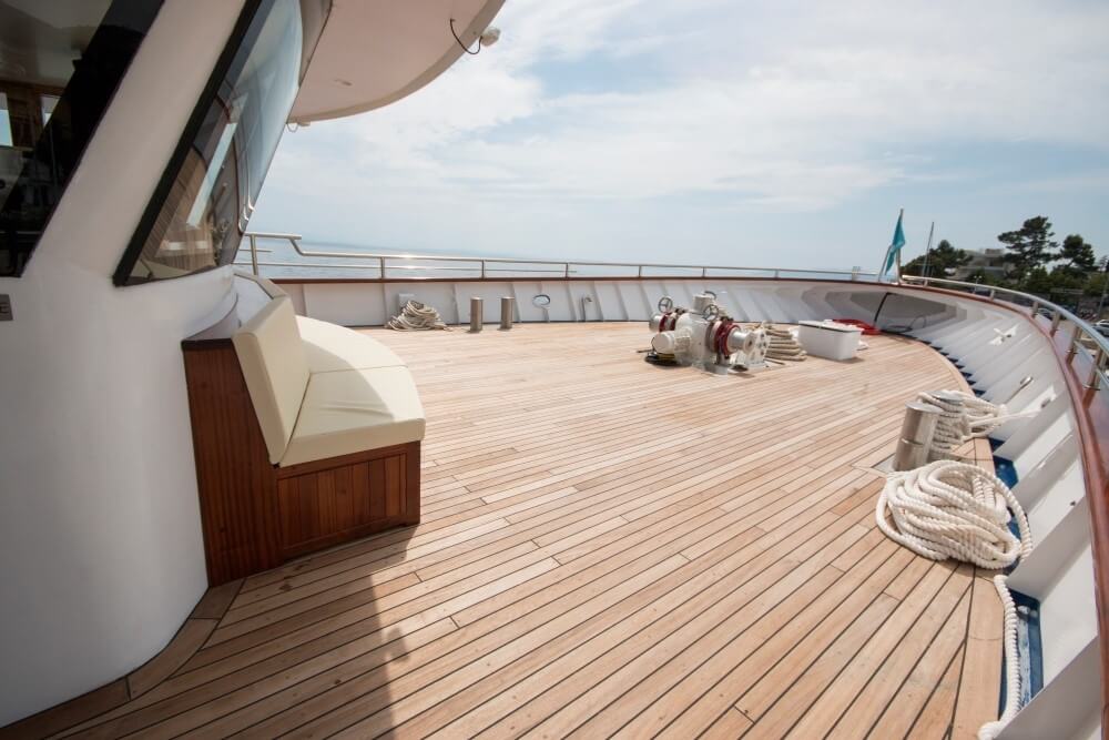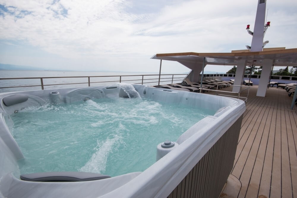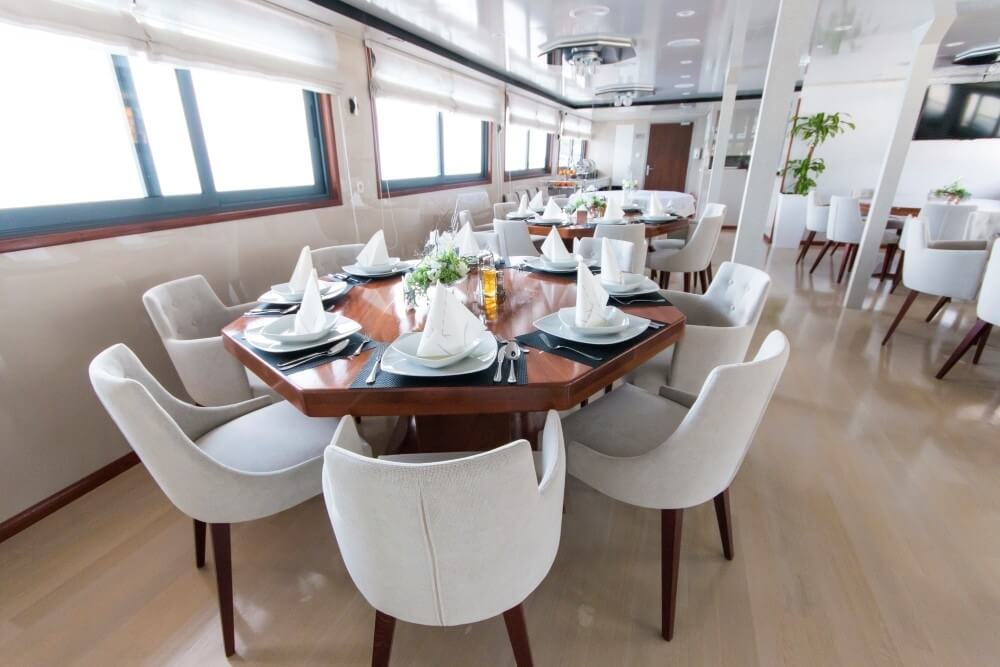 The expansive sun deck is a favorite among guests, complete with a jacuzzi and plenty of loungers for soaking up the sun and sea breeze. Onboard dining is a culinary highlight, with a refined restaurant serving fresh local dishes prepared with care and flair.