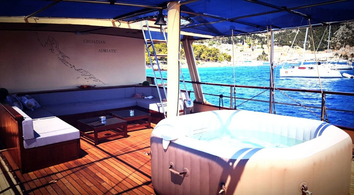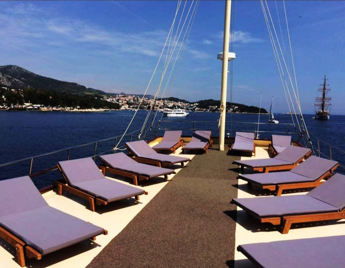 The spacious sun deck, equipped with loungers, is ideal for soaking up the sun and enjoying breathtaking views of Croatia’s islands and turquoise waters. It’s the perfect place to unwind with a good book or simply enjoy the sea breeze.