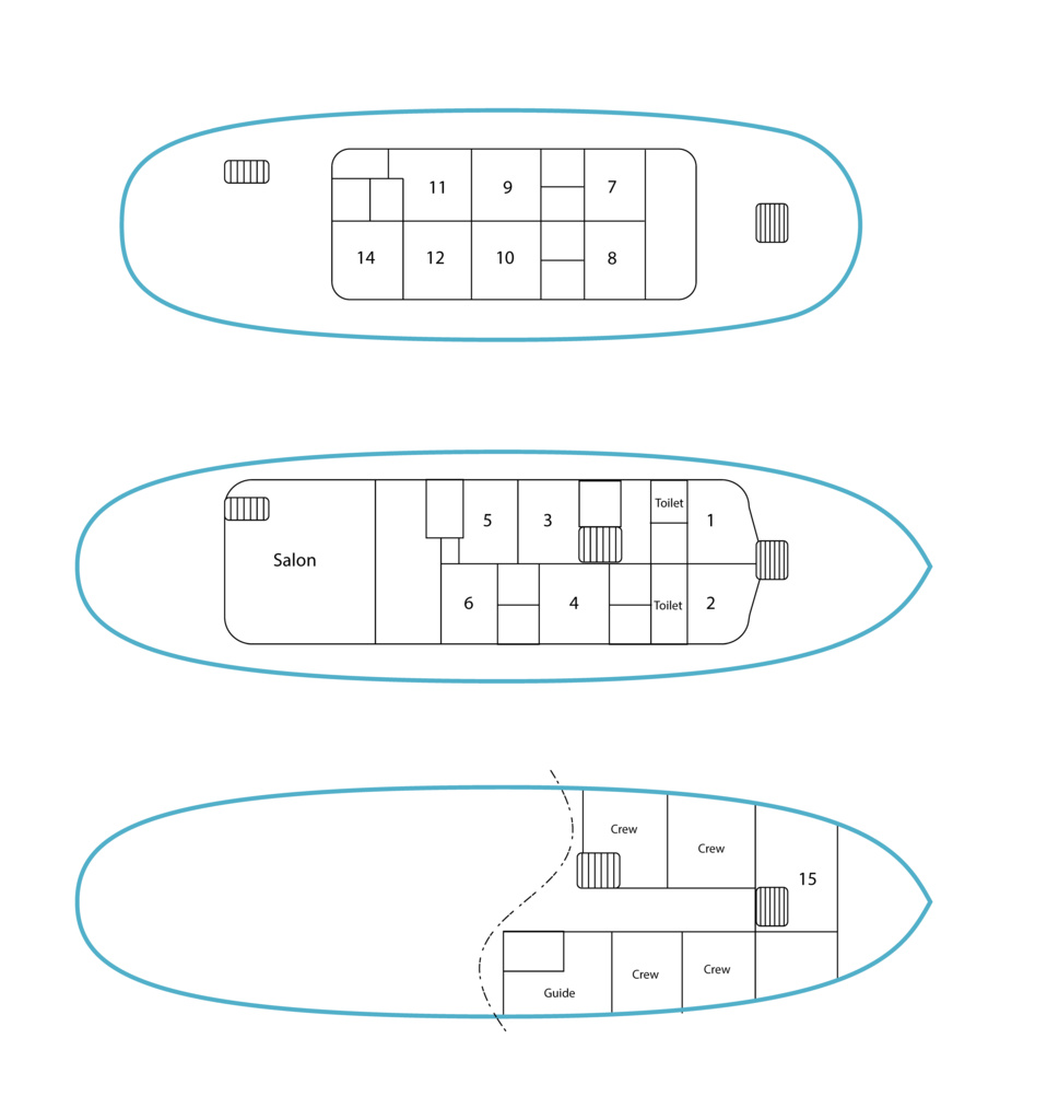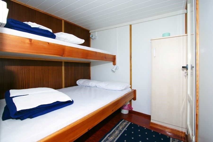 The ship features 14 comfortable guest cabins spread across three decks, including a mix of double, triple (double + bunk), and bunk bed arrangements. While each cabin offers essential amenities for a pleasant stay, there are also two shared toilets/showers available for guest use. A dedicated cabin for the tour manager ensures smooth organisation throughout the journey.