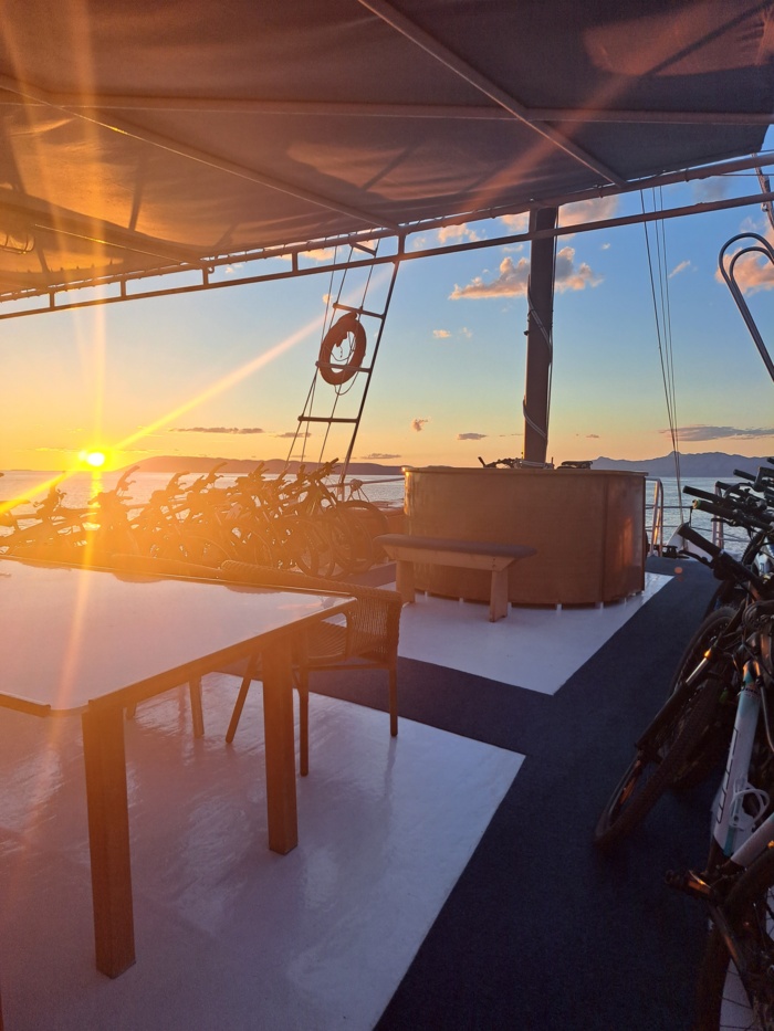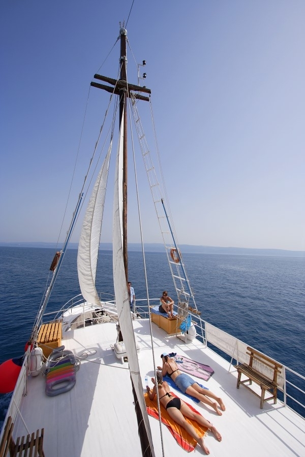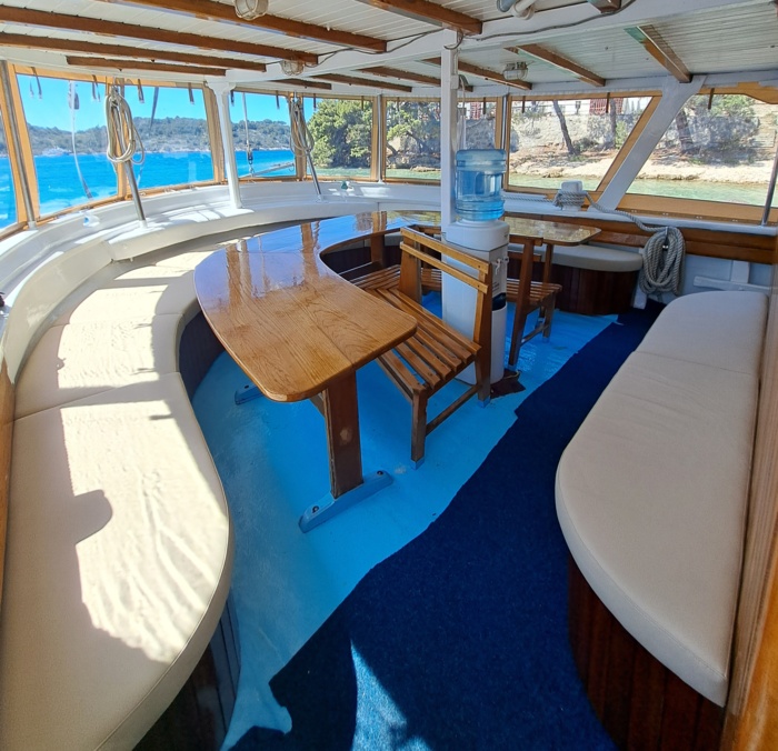 The 80 m² sun deck provides a welcoming space to unwind – perfect for soaking up the Mediterranean sun or enjoying the sea breeze and coastal views. Cabins on the lower deck are equipped with washbasins, while the vessel offers three shared toilets and showers that are clean and thoughtfully maintained.
