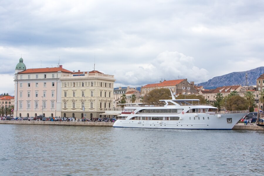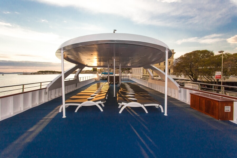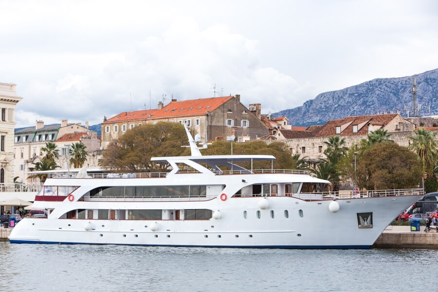A standout feature of the Maritimo is its expansive 250 m² sundeck, complete with a Jacuzzi and sun loungers – an ideal space to soak up the Adriatic sun or simply take in the breathtaking coastal views. The vessel’s swimming platform at the rear provides easy access to the sea, with snorkelling and swimming gear available for guests looking to dive into the crystal-clear waters.