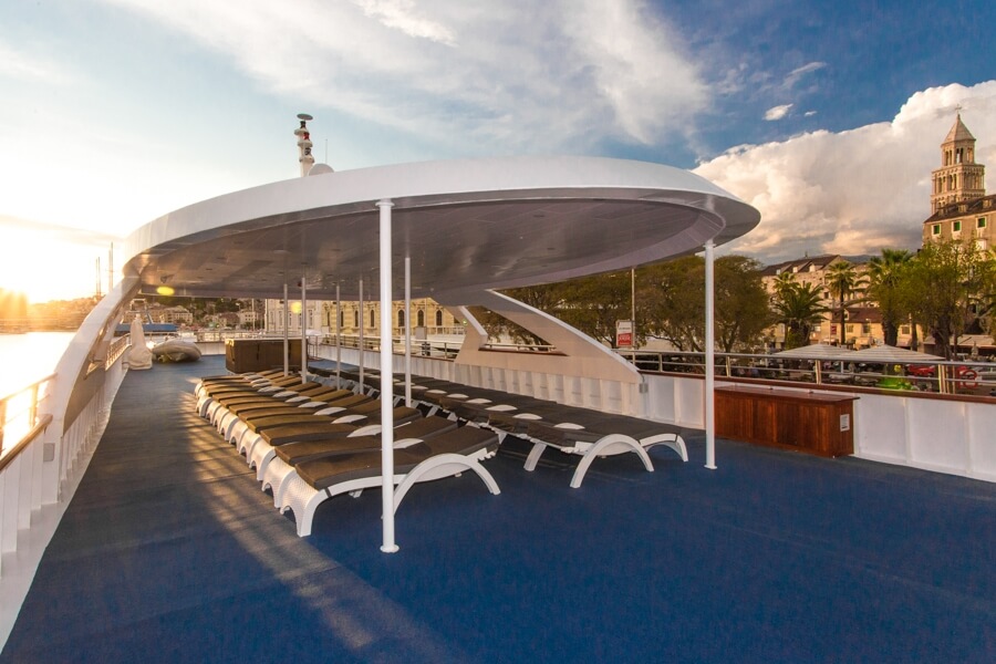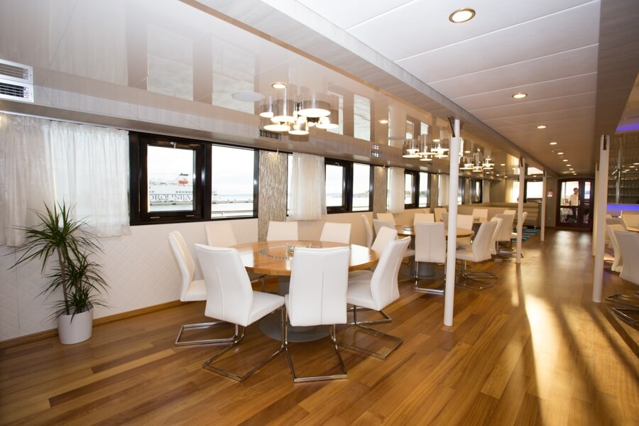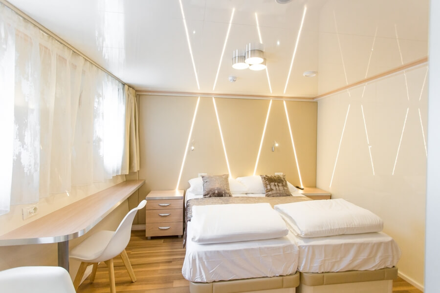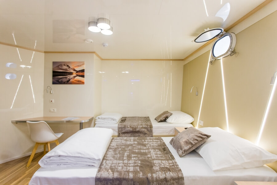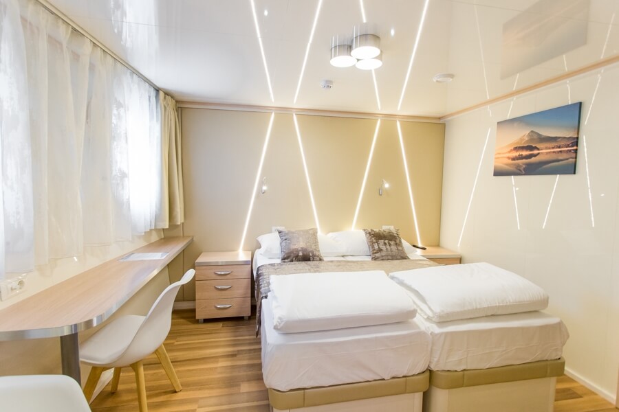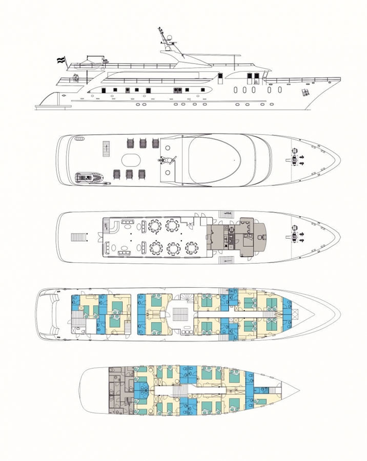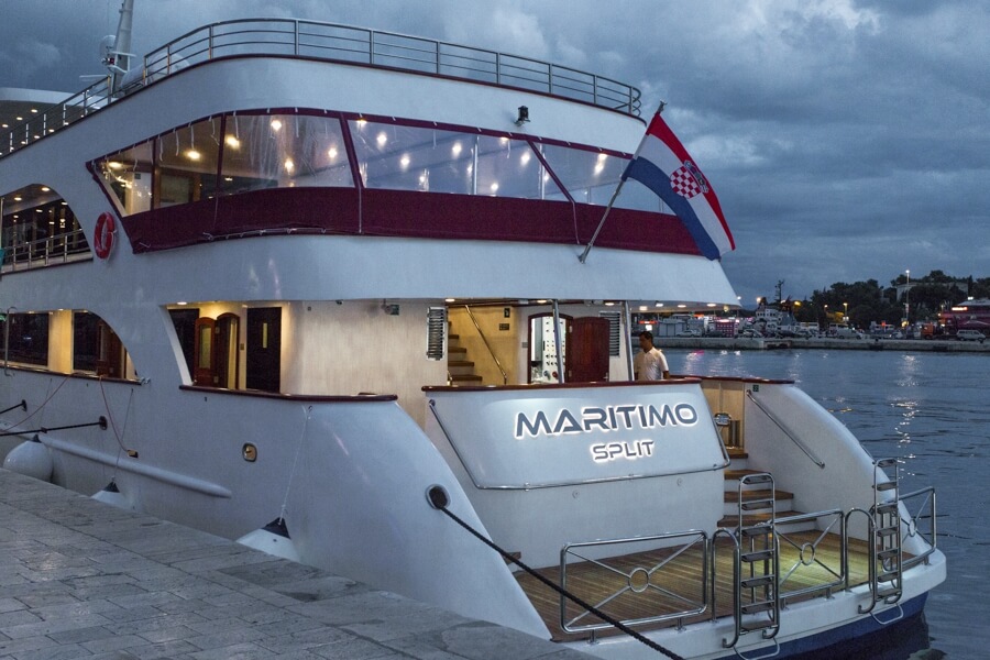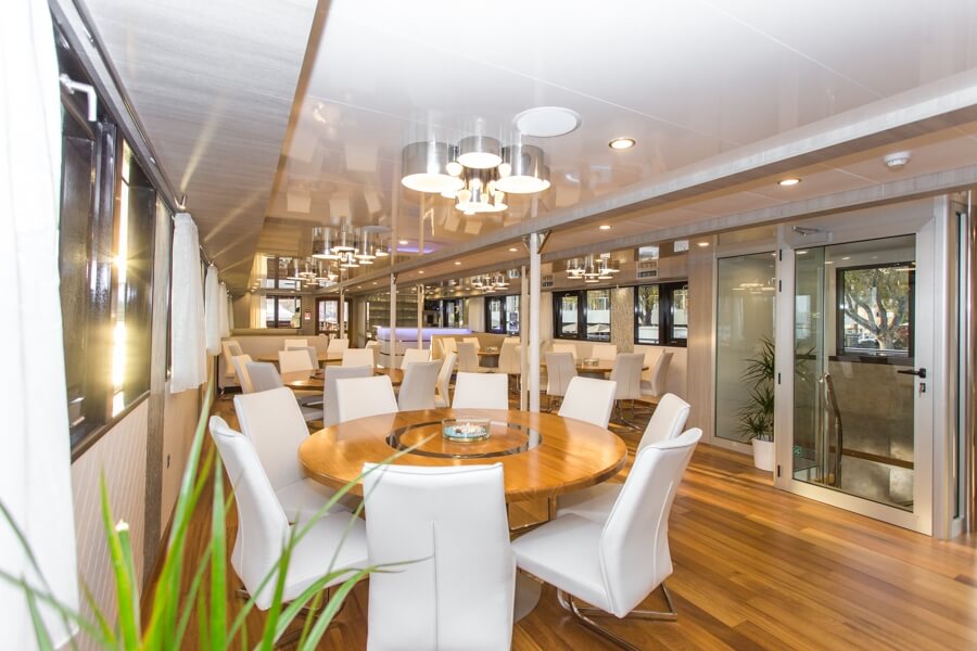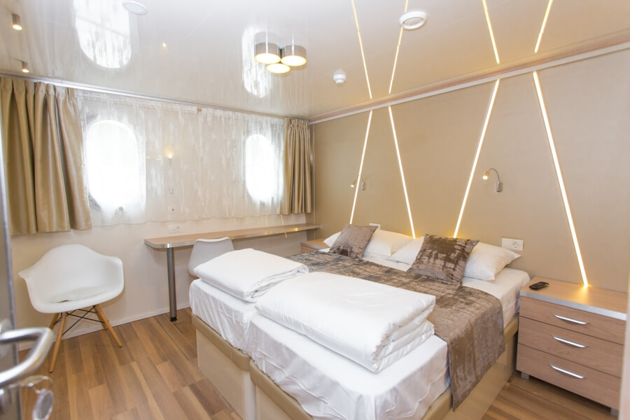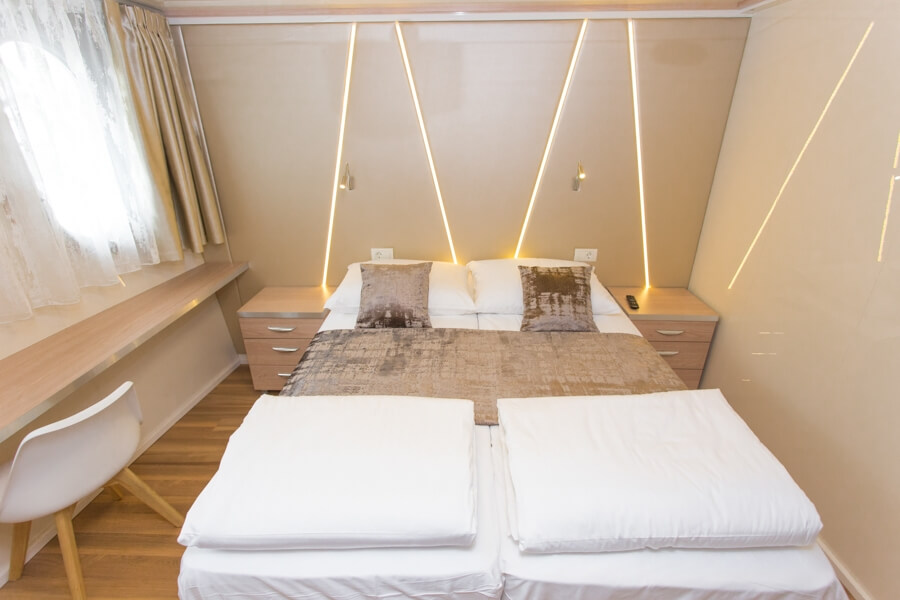 Launched in 2017, the MV Maritimo is a state-of-the-art vessel designed to provide a refined yet intimate cruising experience. With a length of 48.5 meters and a width of 8.6 meters, she accommodates up to 36 guests in 18 spacious, en-suite cabins – available as double, twin, or triple – each fully air-conditioned and equipped with modern conveniences such as LCD TVs, hairdryers, and safes. Daily cabin service ensures guests enjoy the highest level of comfort throughout the voyage.