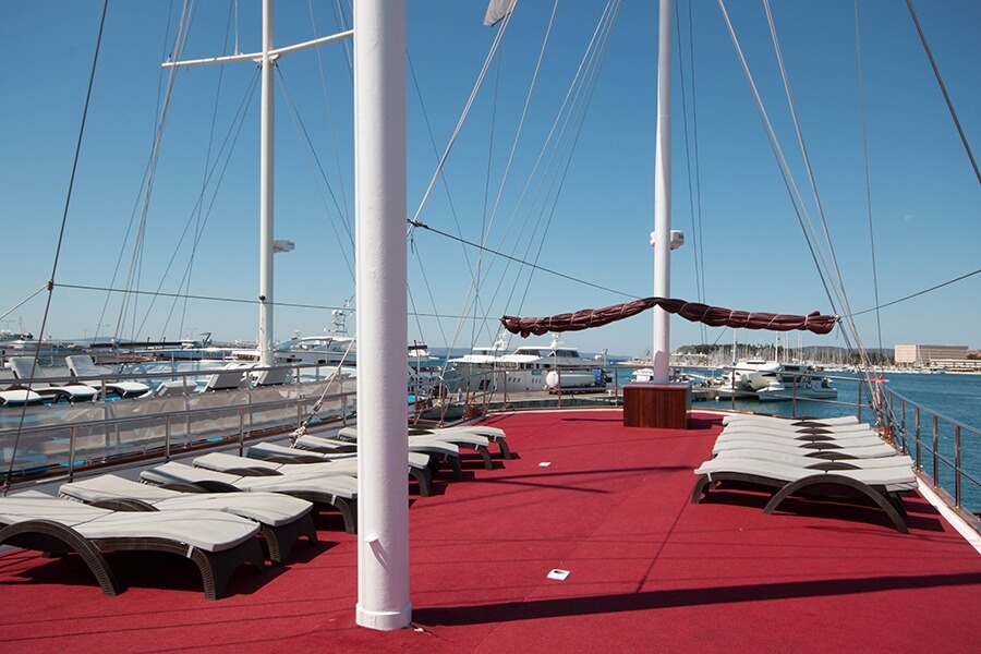 The expansive sun deck is perfect for unwinding, with loungers and open views of Croatia’s islands and sparkling waters offering a serene setting for relaxation. Whether you’re soaking up the sun or enjoying a quiet moment under the sky, the deck is your front-row seat to the beauty of the sea.