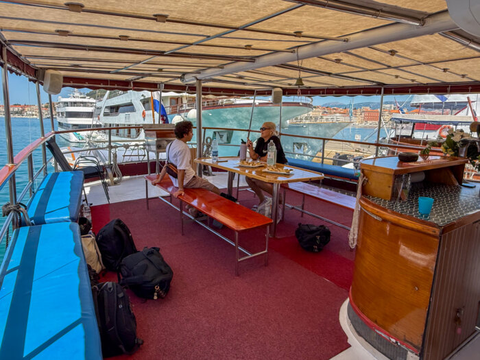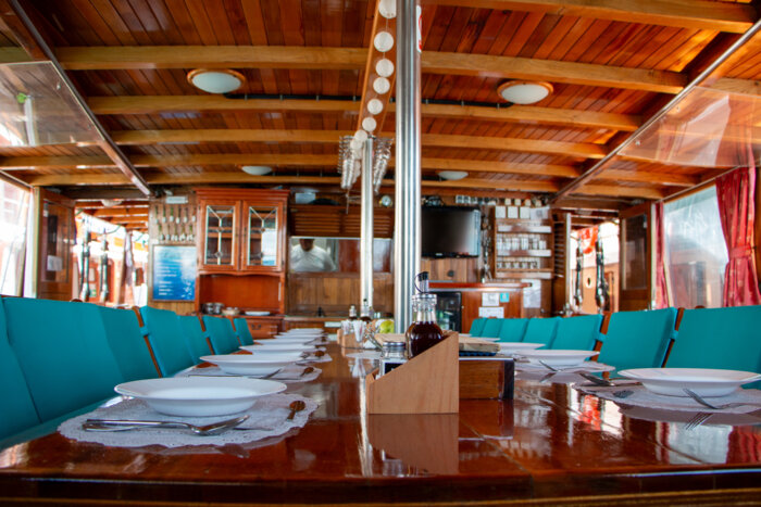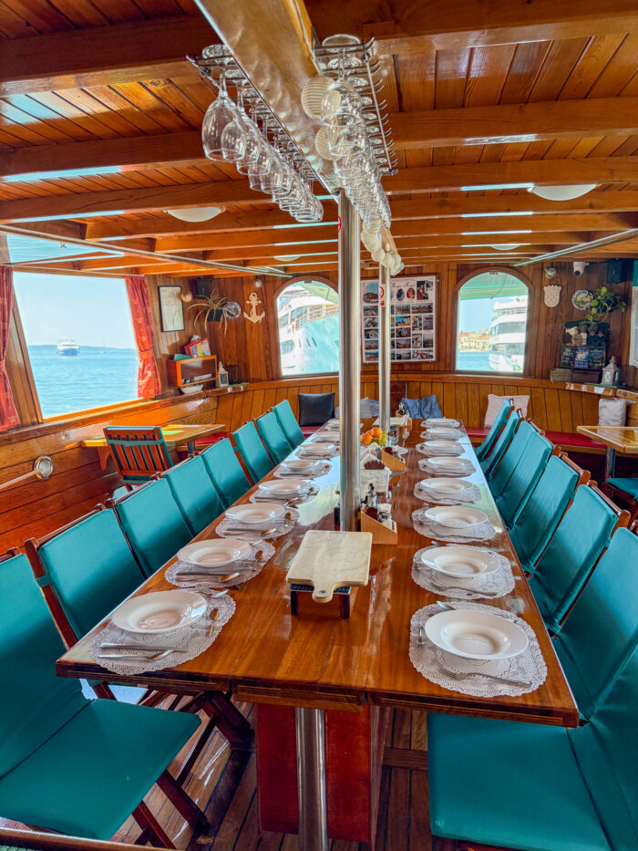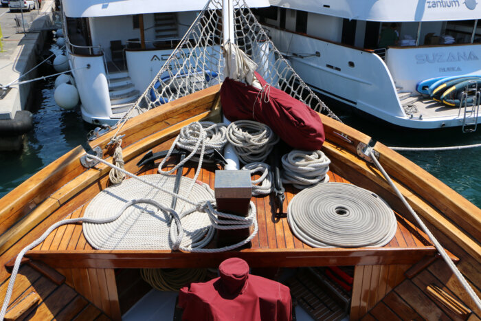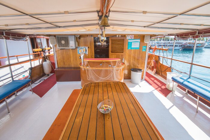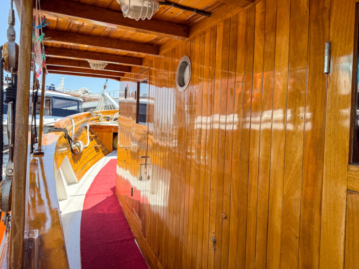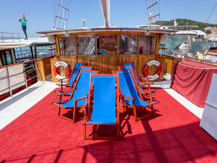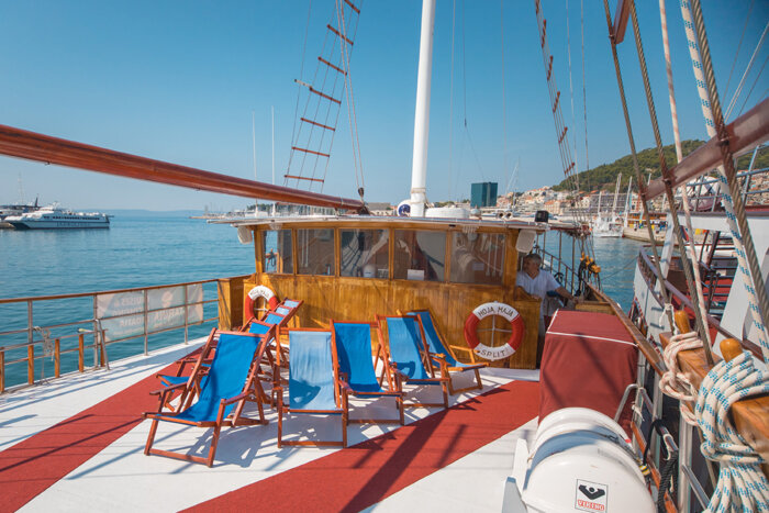 The generous 90 m² sun deck is a favourite spot for guests – ideal for lounging, sunbathing, or simply enjoying uninterrupted views of the sparkling Adriatic. Whether relaxing in the sea breeze or sharing stories with fellow travellers, every moment on deck captures the essence of traditional cruising.