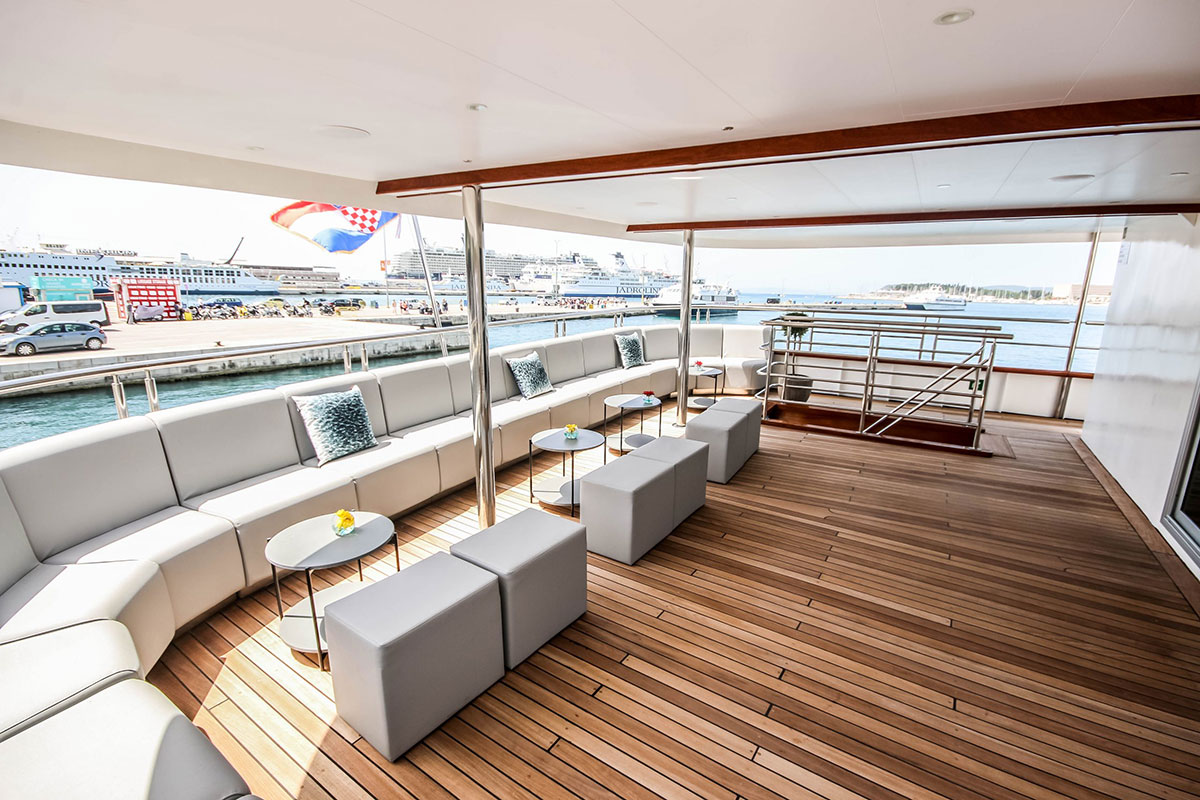 On deck, guests can unwind on the spacious sunbathing area, complete with a jacuzzi and plenty of loungers – the perfect place to take in panoramic views of the Croatian coastline. The onboard dining salon offers a refined culinary experience, featuring delicious dishes prepared with fresh, locally sourced ingredients.