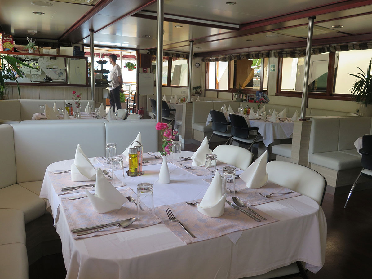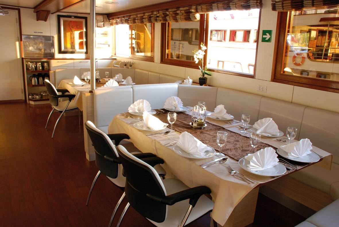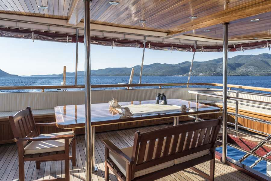 The spacious sun deck is ideal for unwinding, with comfortable loungers and panoramic views of the sea and islands creating a perfect setting for relaxation. Mealtimes are a true pleasure, with delicious dishes prepared from fresh, local ingredients and served in an inviting dining area that reflects the region’s culinary traditions.