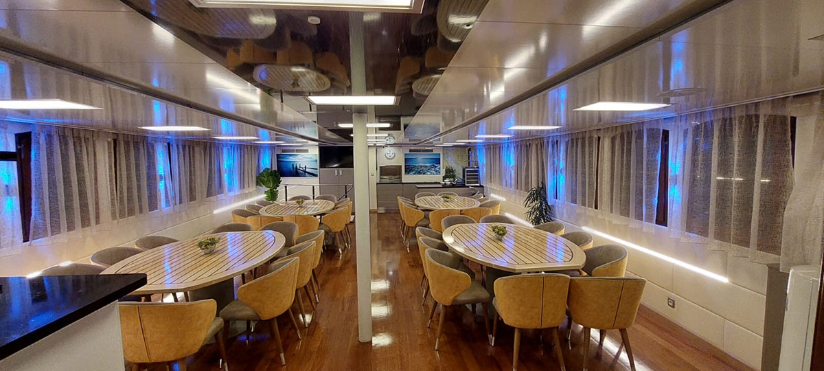 Dining on board is a highlight of the journey, with freshly prepared meals made from local ingredients served in an elegant and welcoming dining area. Whether you’re enjoying breakfast with a sea view or a relaxed dinner with fellow travellers, the atmosphere is always warm and inviting.