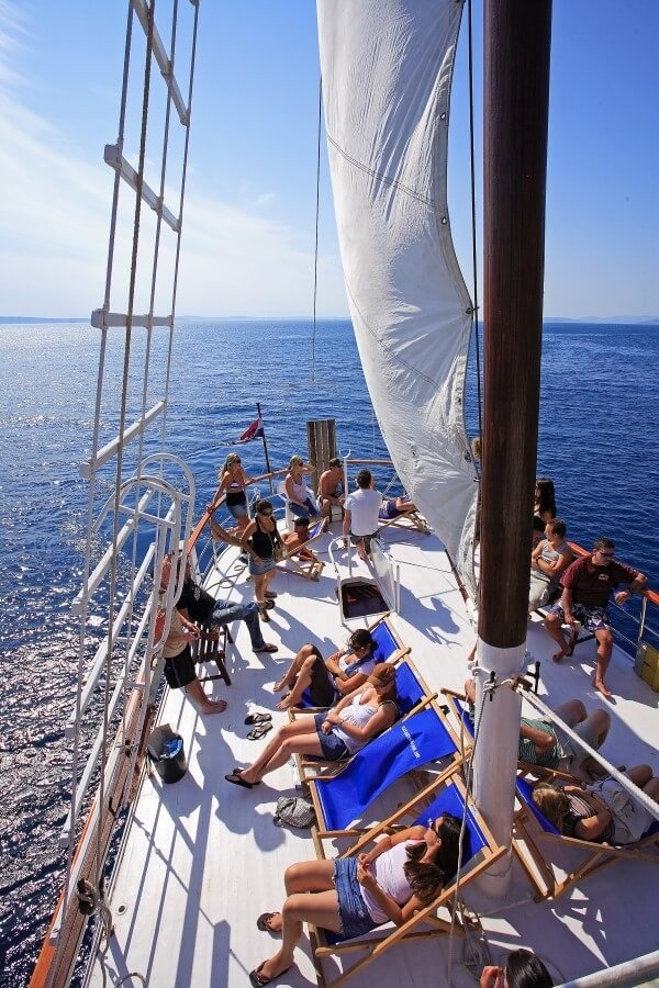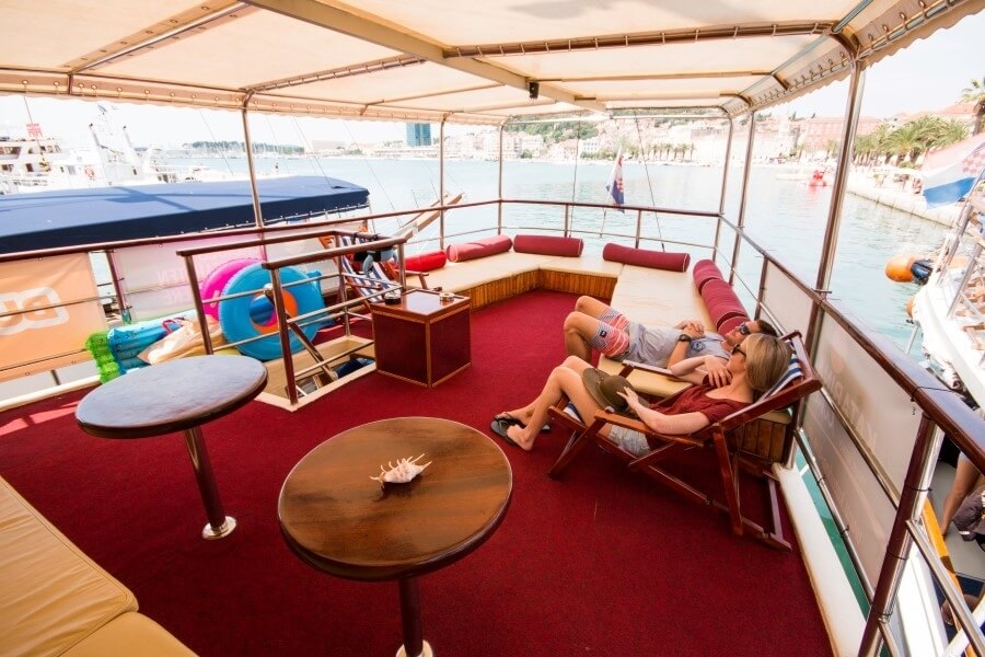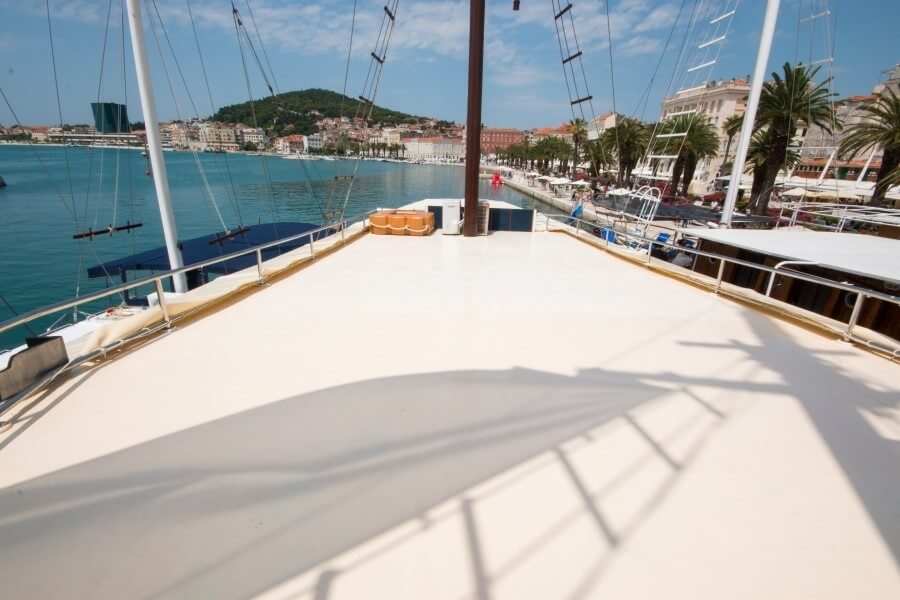 The onboard dining area and communal spaces reflect the spirit of Dalmatia – casual, welcoming, and full of local flavour. Guests can unwind on the sun deck, basking in the Mediterranean sun while admiring panoramic views of the sea and islands. A rear swimming platform allows easy access to the water for a refreshing swim or snorkelling break.