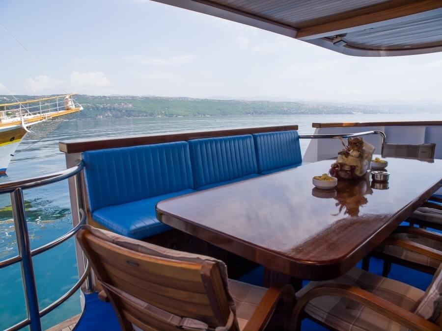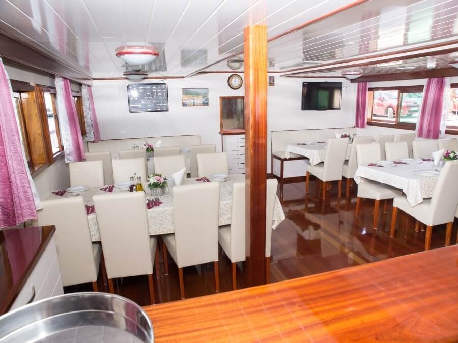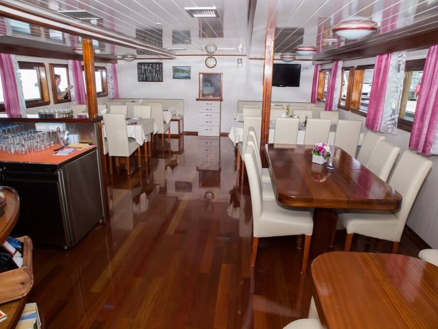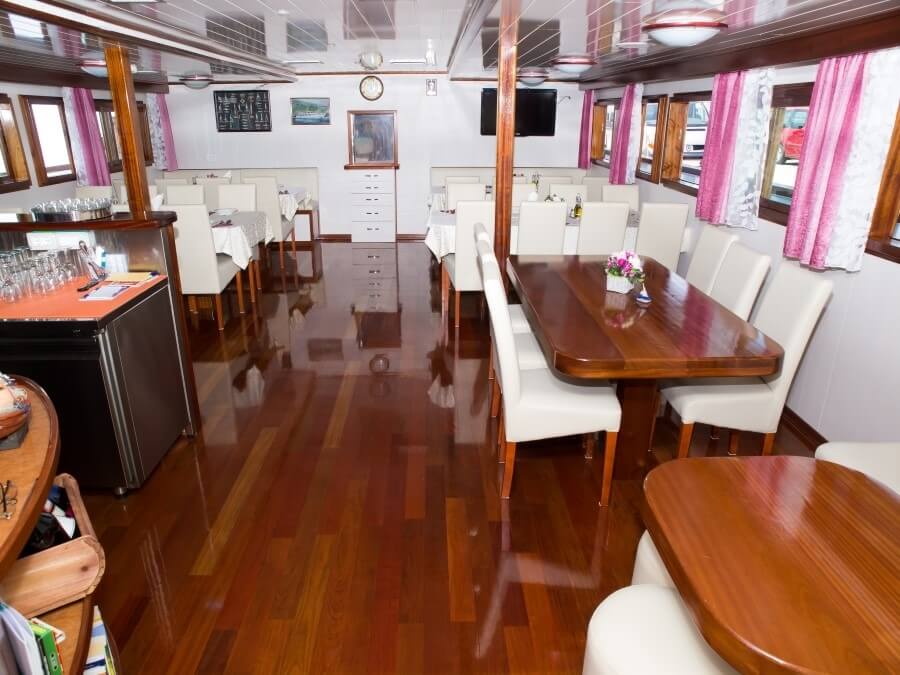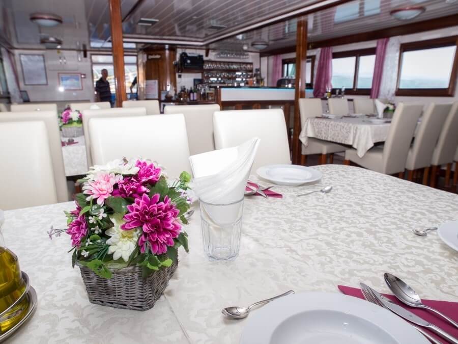 Onboard dining is a highlight, with freshly prepared meals made from local ingredients, served in a cozy and inviting dining area that reflects the region’s rich culinary heritage.