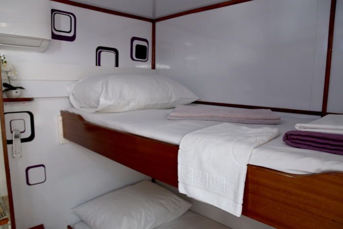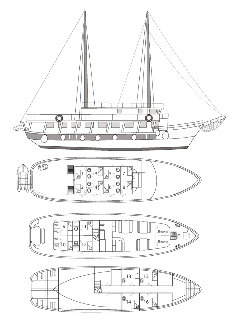 Spacious decks invite guests to soak in panoramic views, while the outdoor seating areas on the upper deck are perfect for catching the breeze or sharing a sunset moment. Cabins are thoughtfully arranged to balance comfort and function, with modern amenities in upper-deck accommodations. Please note: lower-deck cabins are in the Traditional category and include shared shower and toilet facilities.