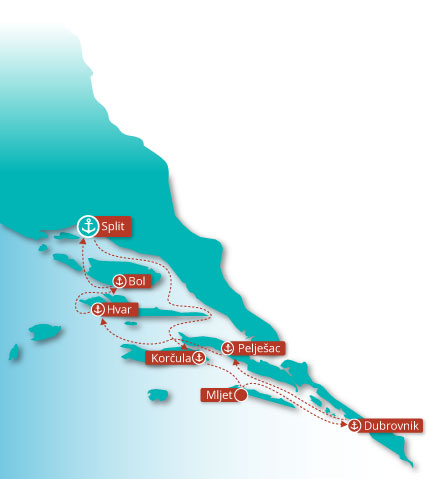 SPLIT – KORČULA – MLJET & DUBROVNIK – DUBROVNIK – PELJEŠAC PENINSULA – HVAR – BOL, PUČIŠĆA/MILNA – SPLIT