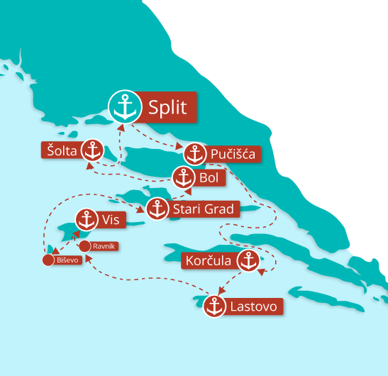 Split – Pučišća – Korčula – Lastovo – Ravnik (Green cave) / Vis – Biševo (Blue cave) / Stari Grad – Bol – Šolta – Split