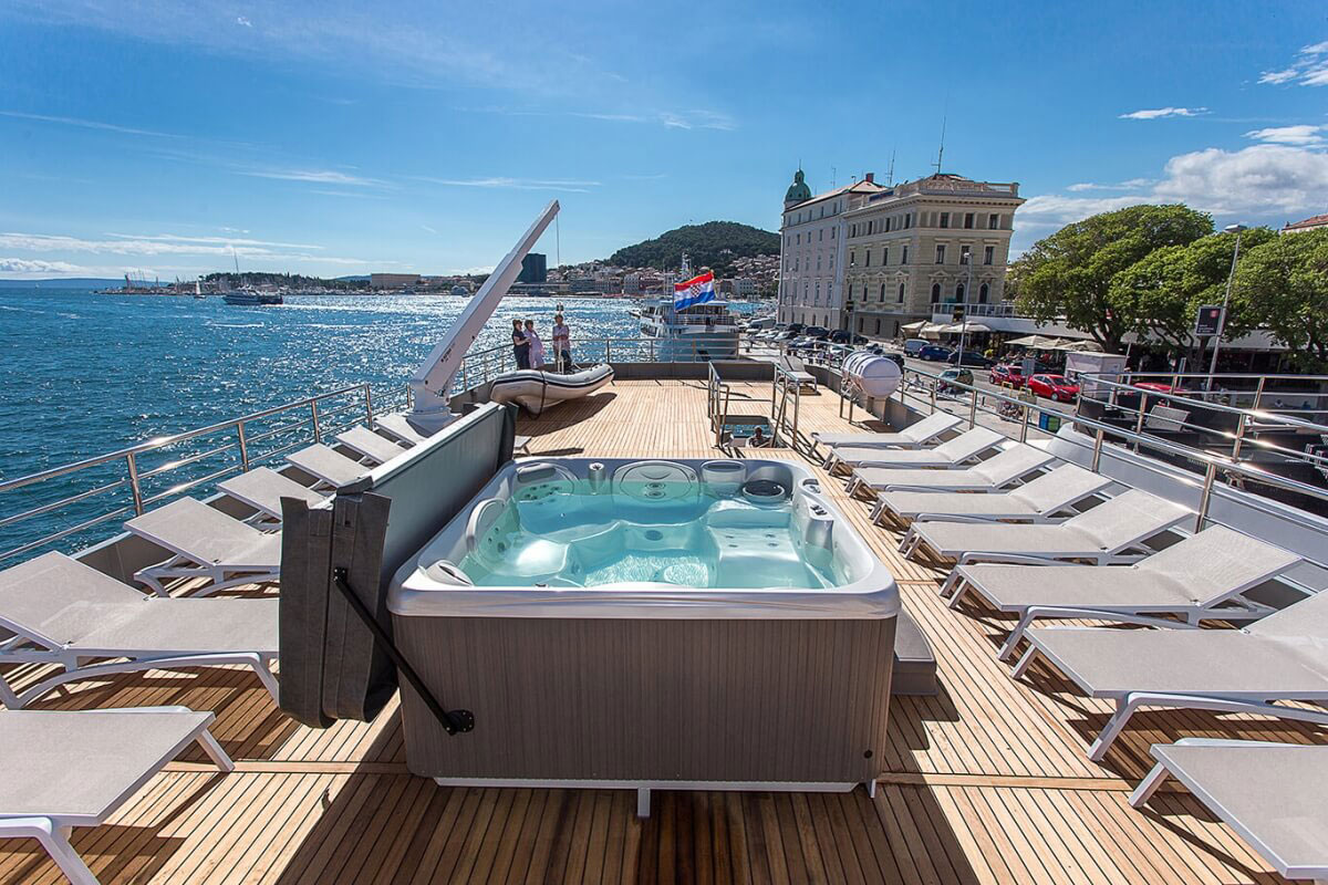 Deluxe vessels are modern and state of the art vessels, 42 to 47 meters in length. The vast sun deck includes a hot tub, a beautiful lounge area and sun beds to enjoy wonderful Adriatic scenery. Deluxe vessels feature spacious, lavishly designed, air-conditioned en-suite cabins (12 to 17 m2 in size) with double or twin beds, safety deposit box, LCD TV, bathroom toiletries, hairdryer, cupboard & wardrobe cabinet.
