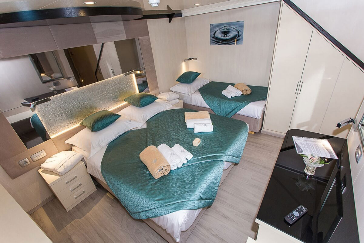 The most recent class of vessels, crème de la crème on the Adriatic Sea. Built with high-quality materials of solid wood, glass, marble, stainless steel and similar materials, these vessels are floating mini boutique hotels. Minimum 47 meters in length, newly built or refurbished, with hot tubs and beautiful sun decks with lounge area, deck chairs and more. Spacious, superbly designed, air-conditioned en-suite cabins with double or twin beds, 15 to 20 m2 in size. Cabins are equipped with wardrobes, deposit boxes, hairdryer, bathroom toiletries, bathrobe, slippers, LCD TV, etc.